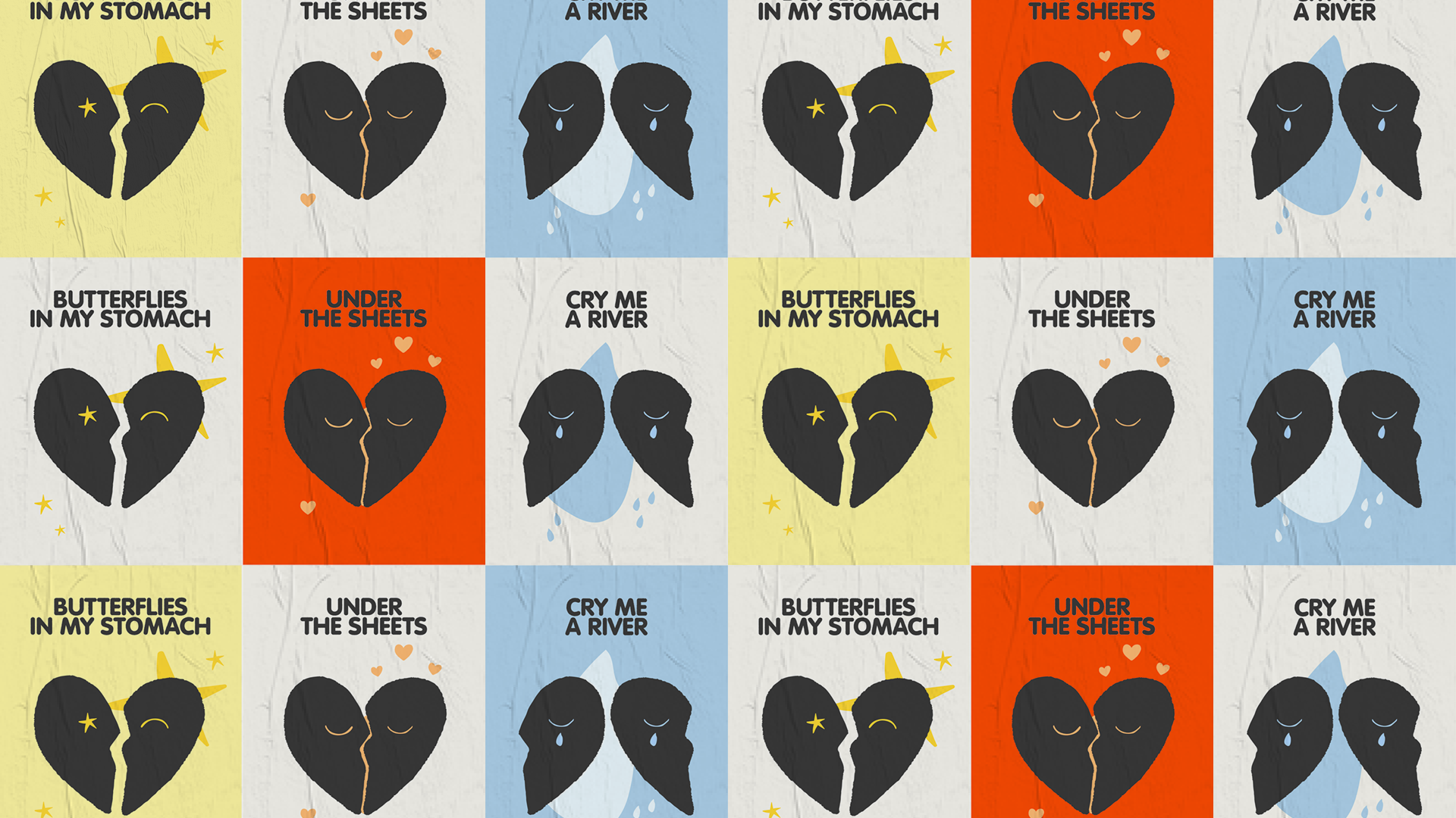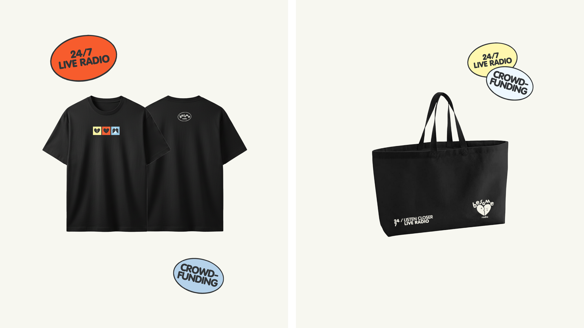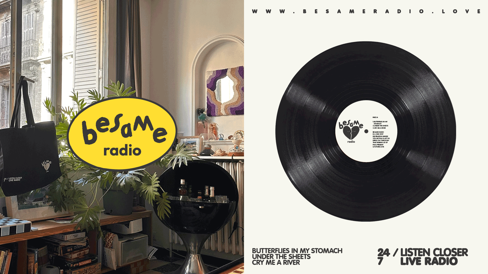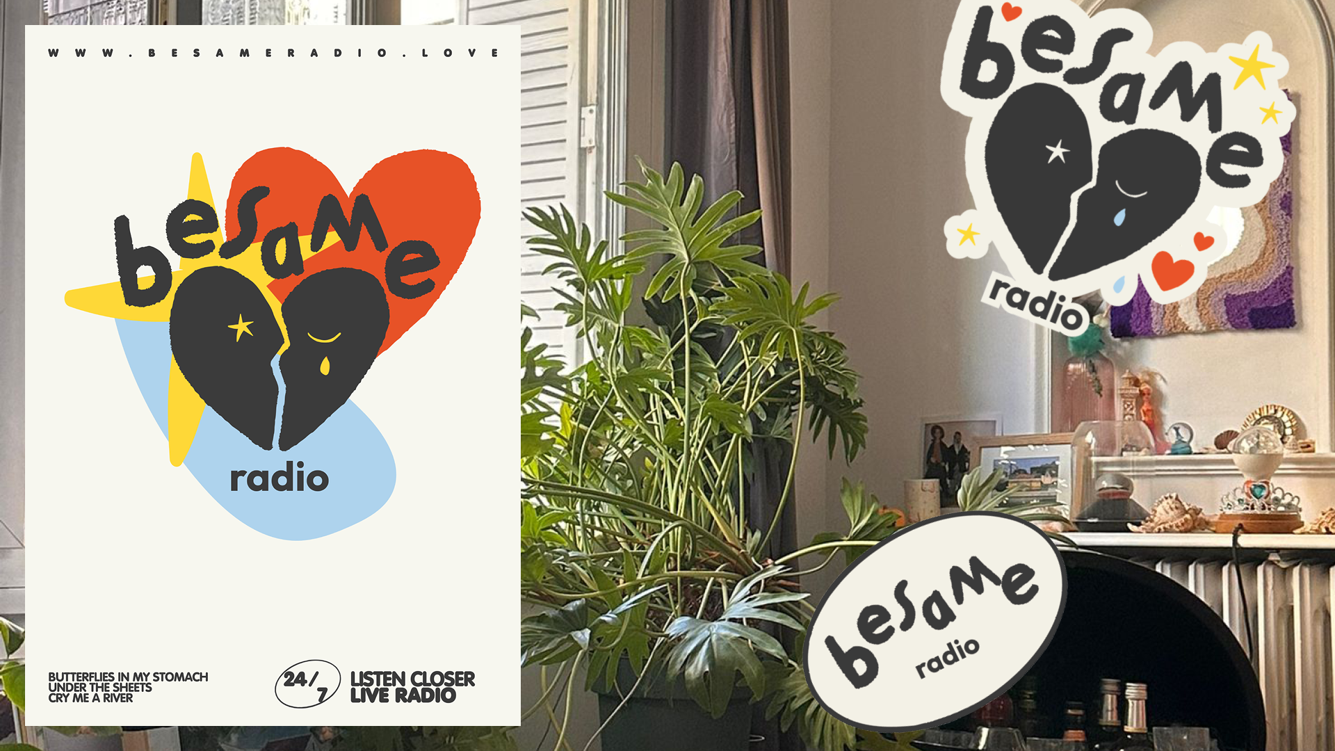 Conception d'une identité visuelle et d’un logotype pour Besame Radio, accompagné d'illustations pour les 3 playlists : Butterflies in my stomach, Under the sheet et Cry me a river. Maquette d'un site web en version desktop, décliné en version mobile. Création de tee-shirt, casquettes et tote bag pour le crowsfunding.