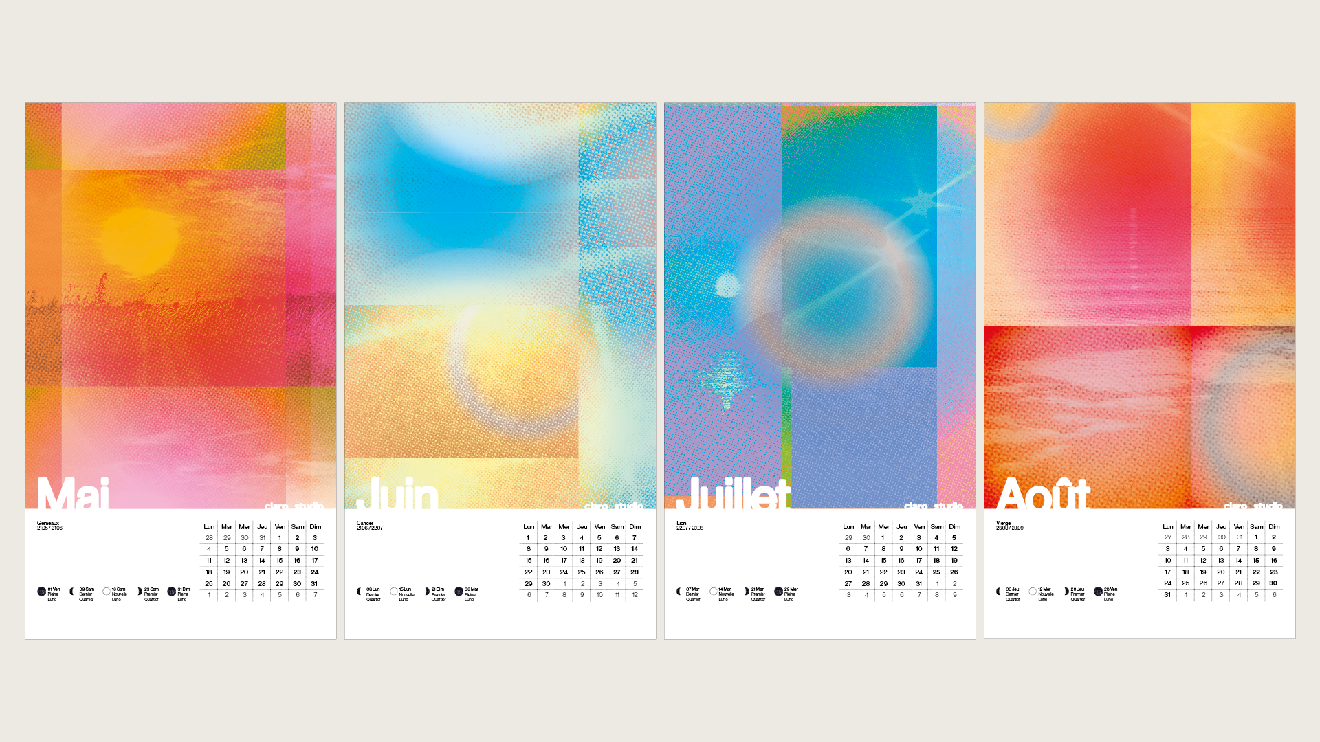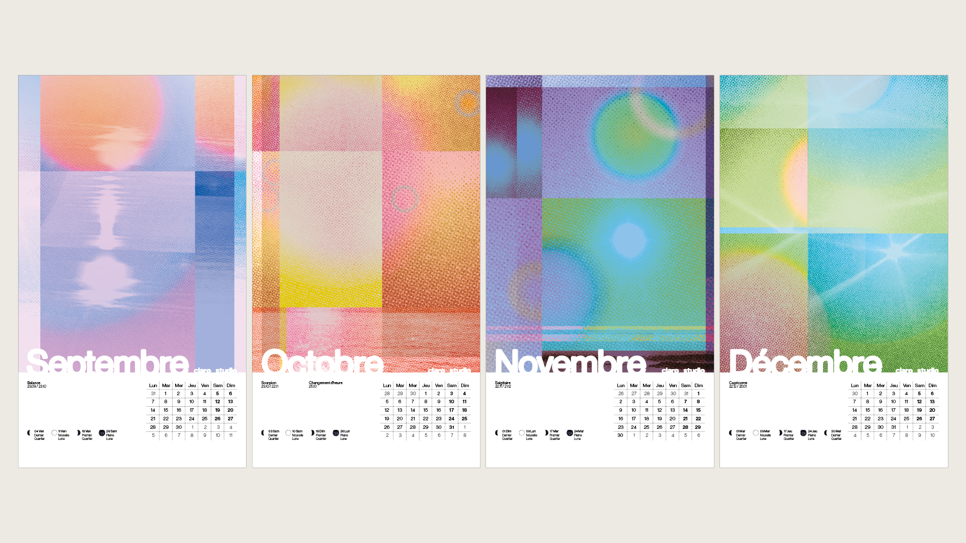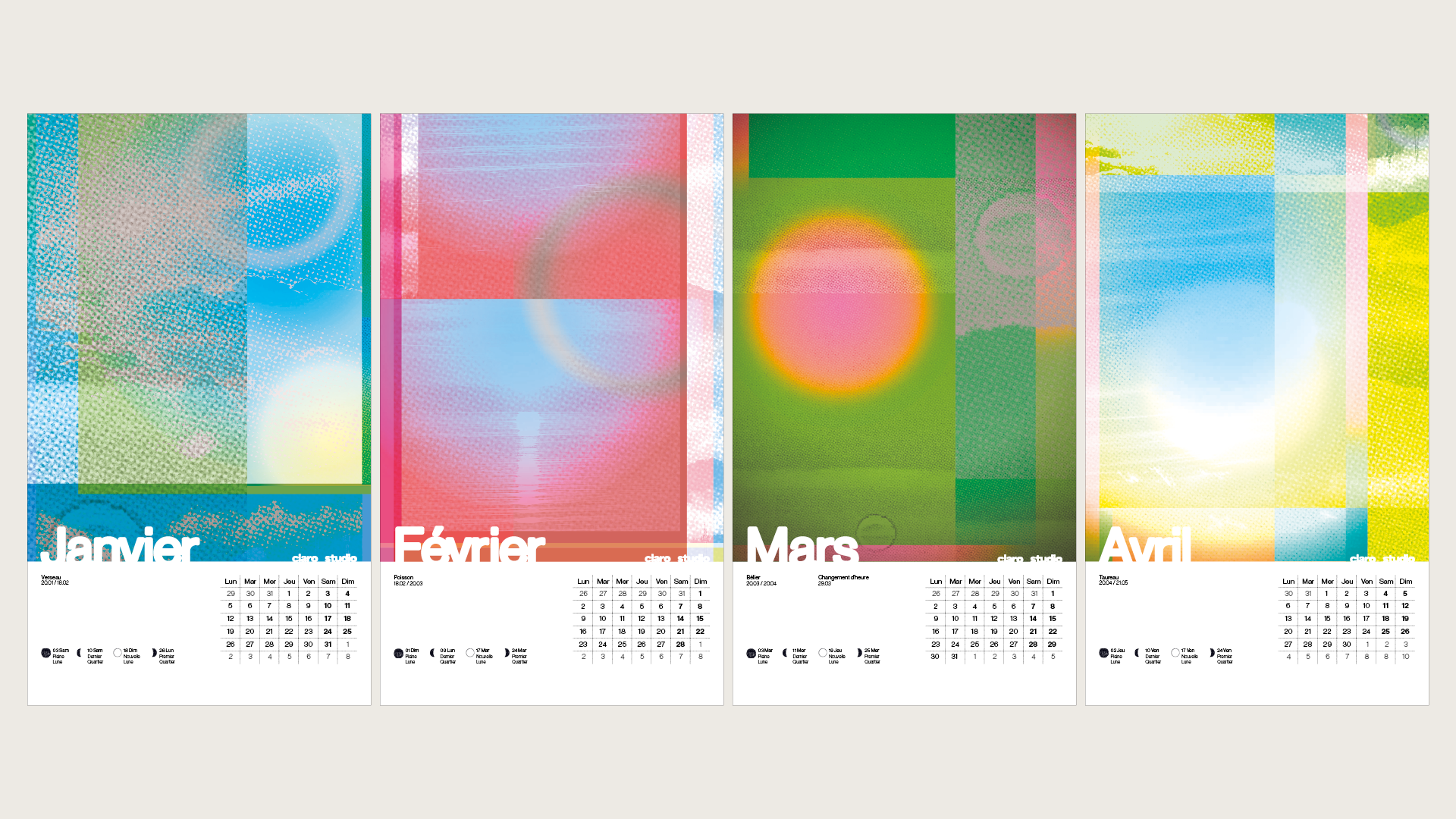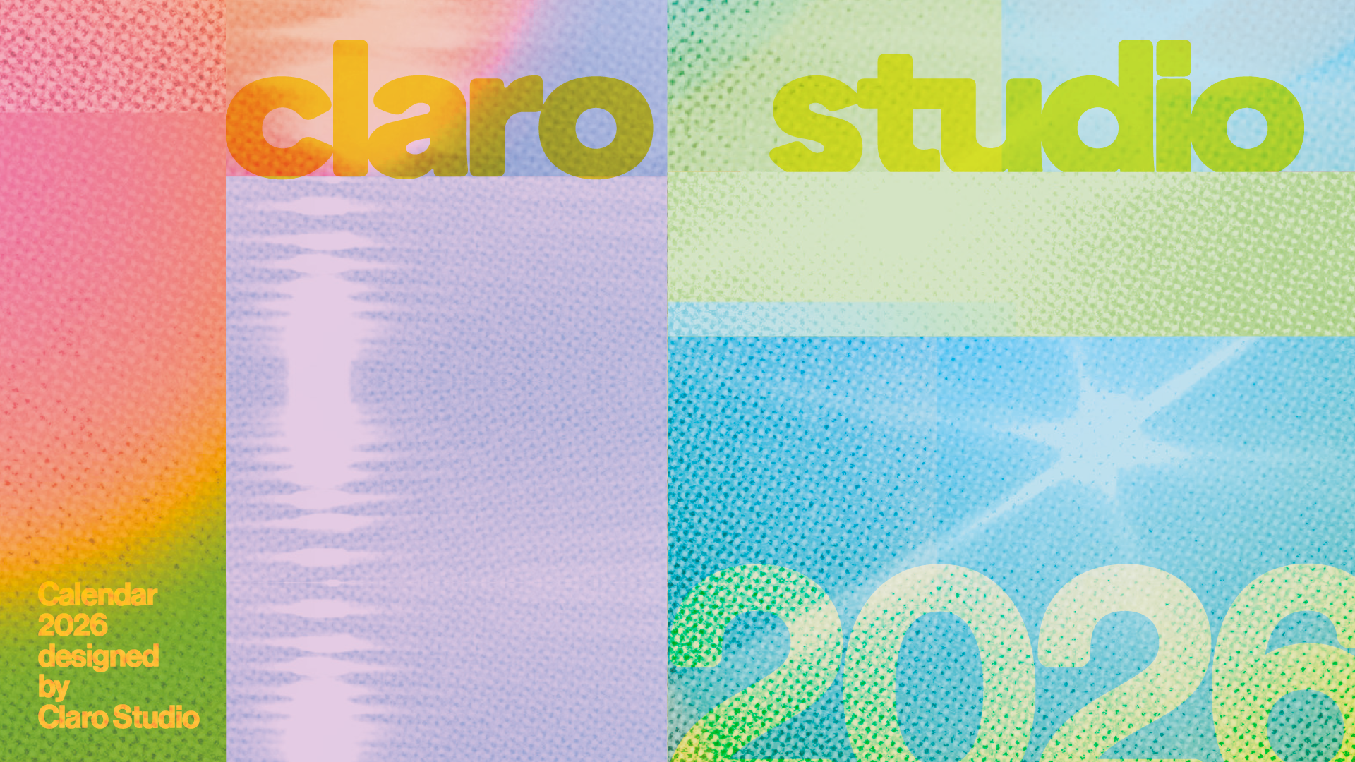 Pour préparer notre entrée dans l’année 2026 avec Claro Studio, nous avons conçu un calendrier mensuel qui tente d’illustrer une lumière différente pour chaque mois. Les visuels sont des collages colorés et reprennent des photographies qui se superposent et se trament au rythme du soleil.