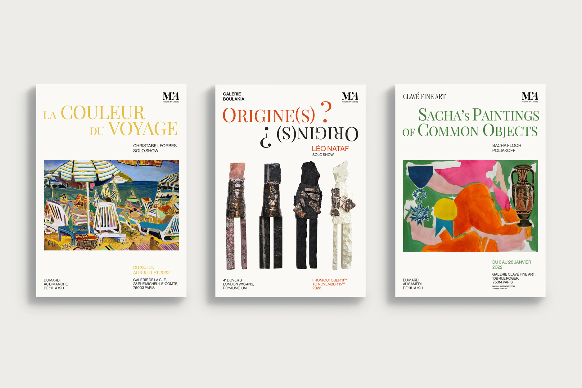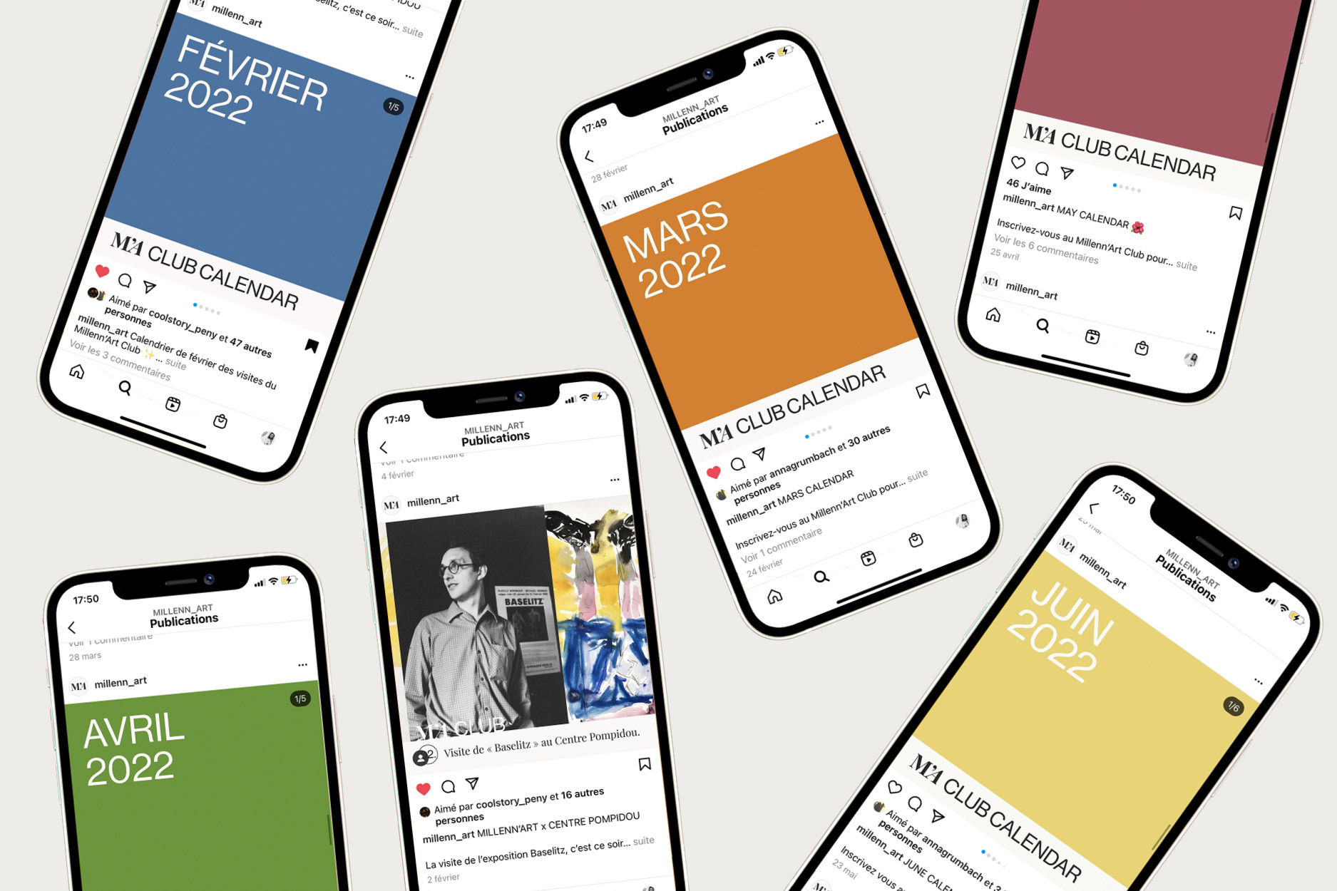 Conception d’une identité visuelle pour Millenn’Art, galerie et club d’initiation à l’art contemporain. Création d’un logo et déploiement de l’ensemble d’une charte graphique sur les différents supports numériques et imprimés (newsletter, posts et stories Instagram, affiches, livret d’exposition...).
