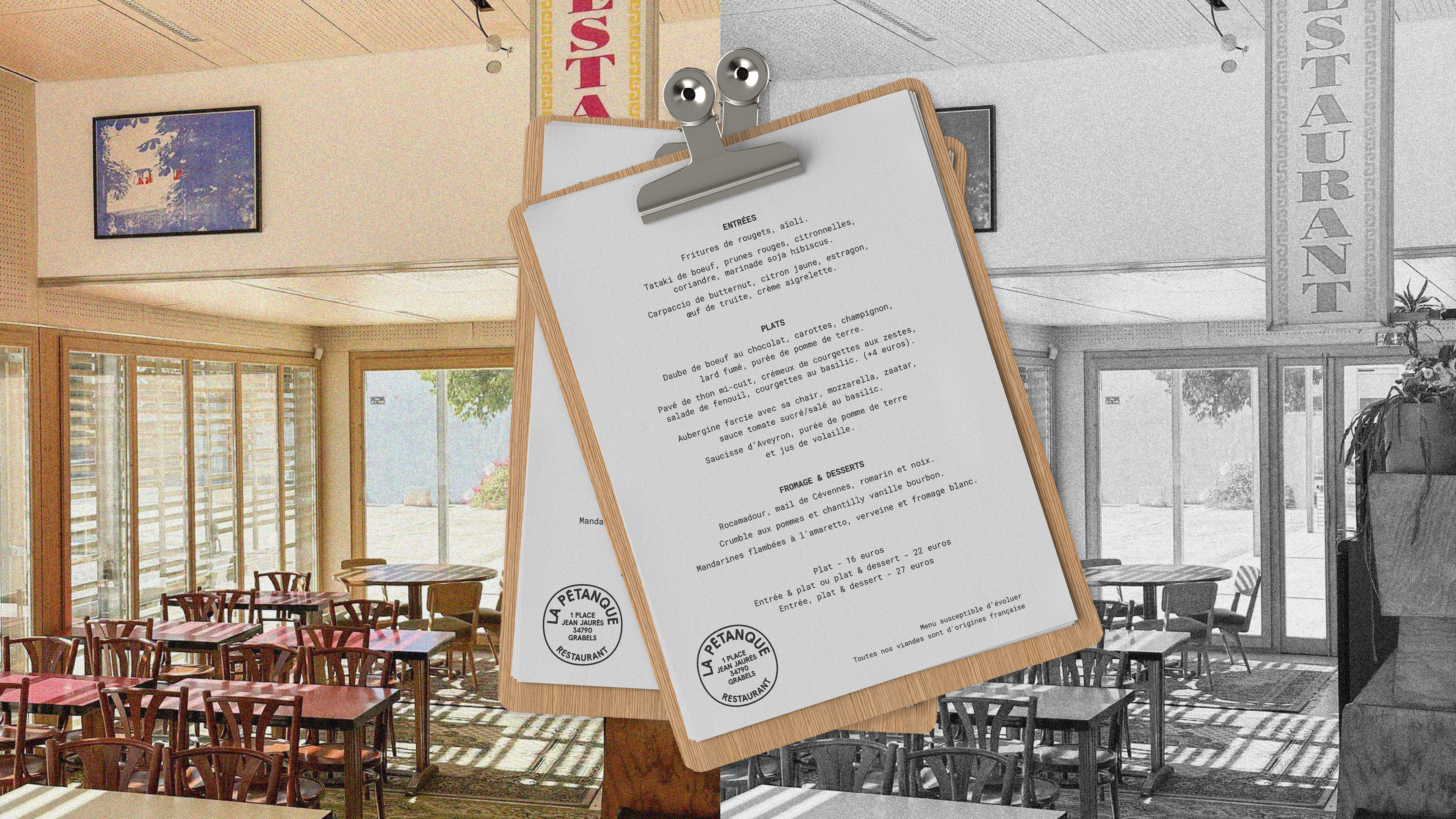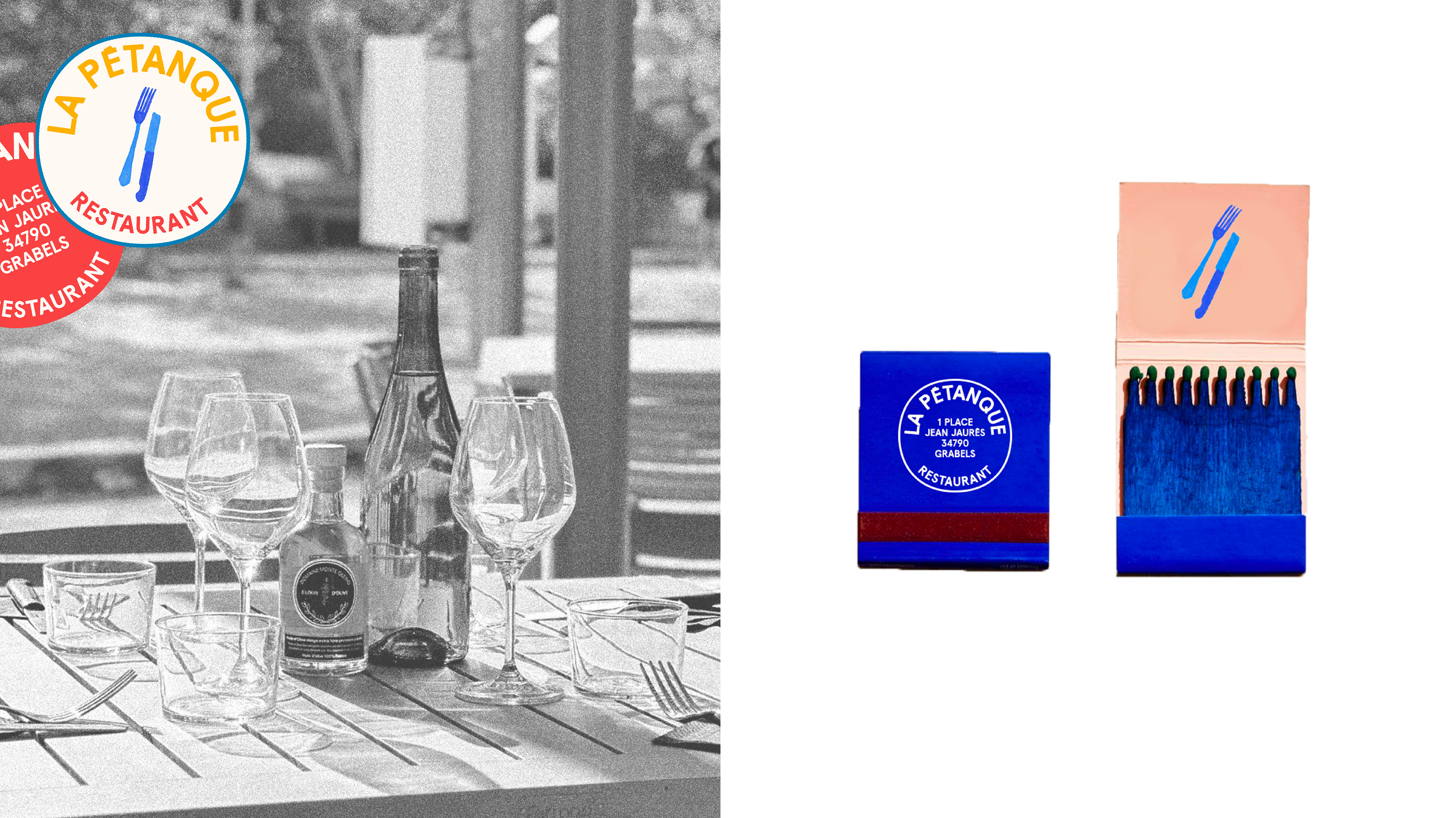 Conception d’une identité visuelle : création d’un logo et déploiement de l’ensemble d’une charte graphique sur les différents supports numériques et imprimés (stickers, alumettes posts et stories Instagram, menu...).